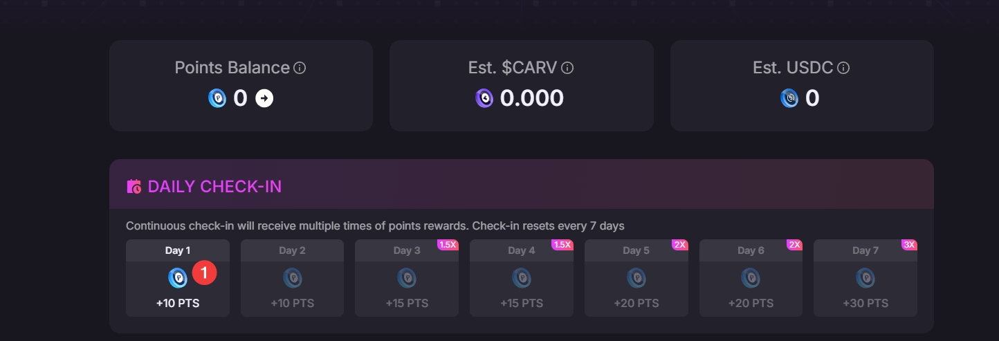 1、对于新用户,若已完成了 Play&Earn 任务,建议一并完成 CARV 官网上的任务。