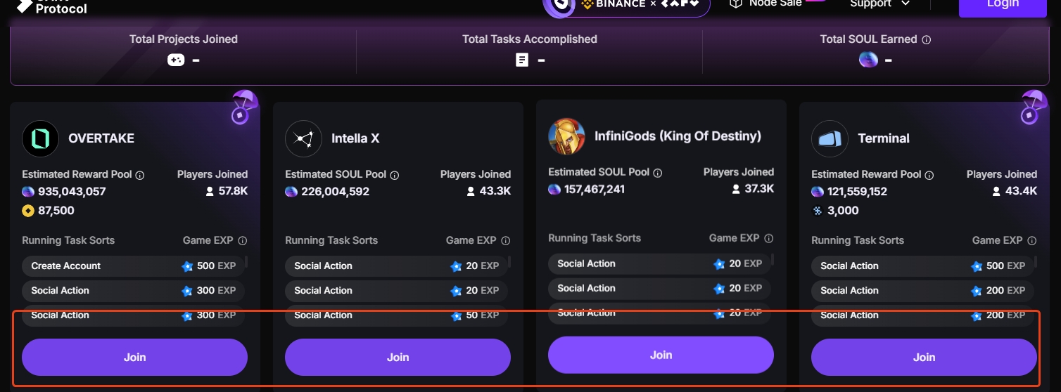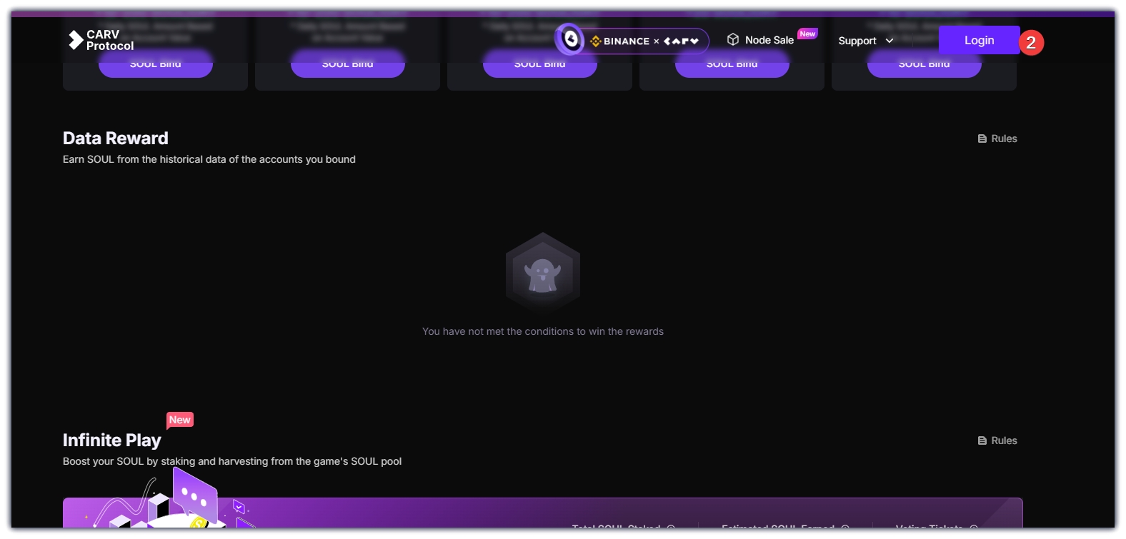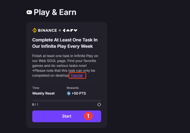 1、点击start,跳转到CARV官网,点击login,选择Binance Web3 Wallet,进行扫码登录,登录后在下方游戏中点击其中一个游戏完成里面任何一个任务即可。点击Tutorial,可查看要求。
