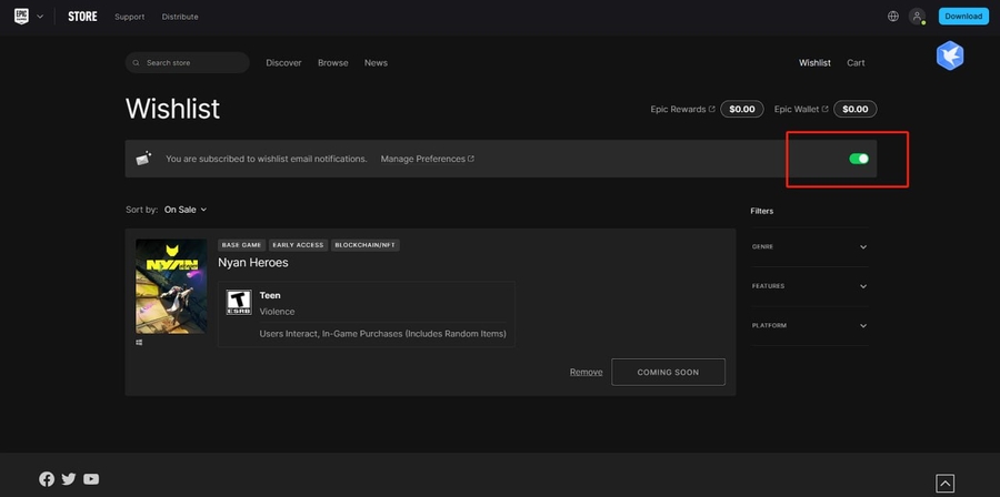 1、先到EPIC GAMES中注册账号,登录后到FPIC游戏商城中搜索并将Nyan Hoeroes添加到愿望清单后,返回验证(记得开梯子,注册还是登录过程是有地区限制的)