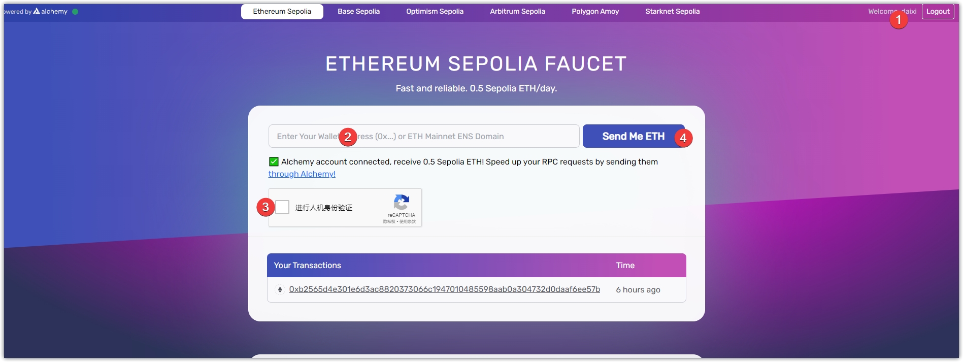 使用谷歌账号直接登录,输入地址,点击真人验证,点击Send Me ETH。