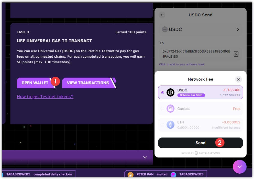 6、TASK3,每天使用粒子钱包,在不同的测试网络中,发送交易,使用USDG扣取gas。一笔50分,上限是一天100笔。