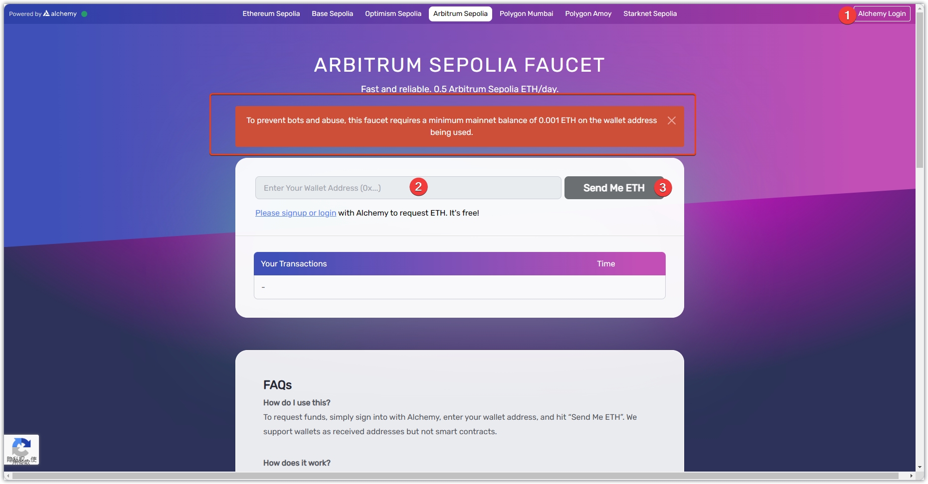 2、进入页面,(1)有alchemy账号直接登录,没有账号的需要注册一个,(2)登录后复制地址粘贴到搜索栏中,(3)点击Send Me ETH。