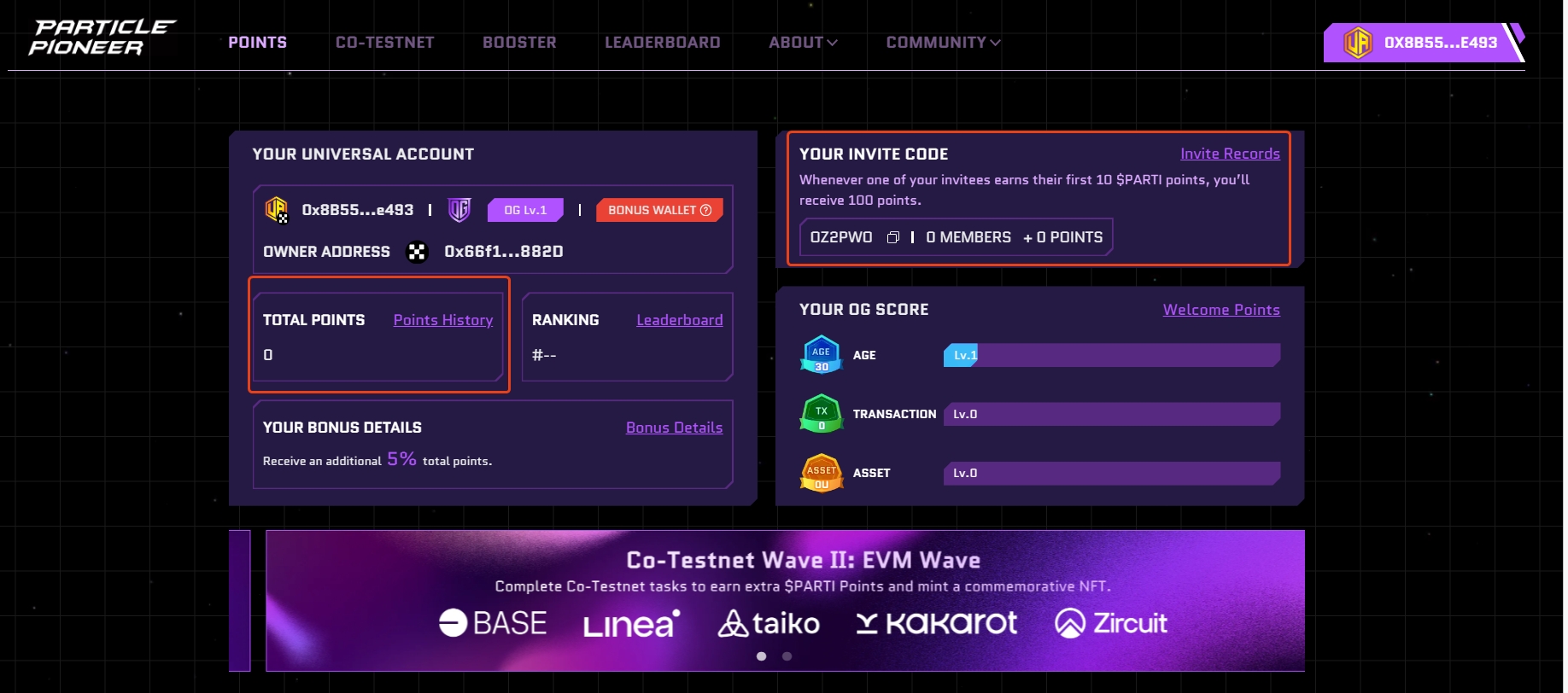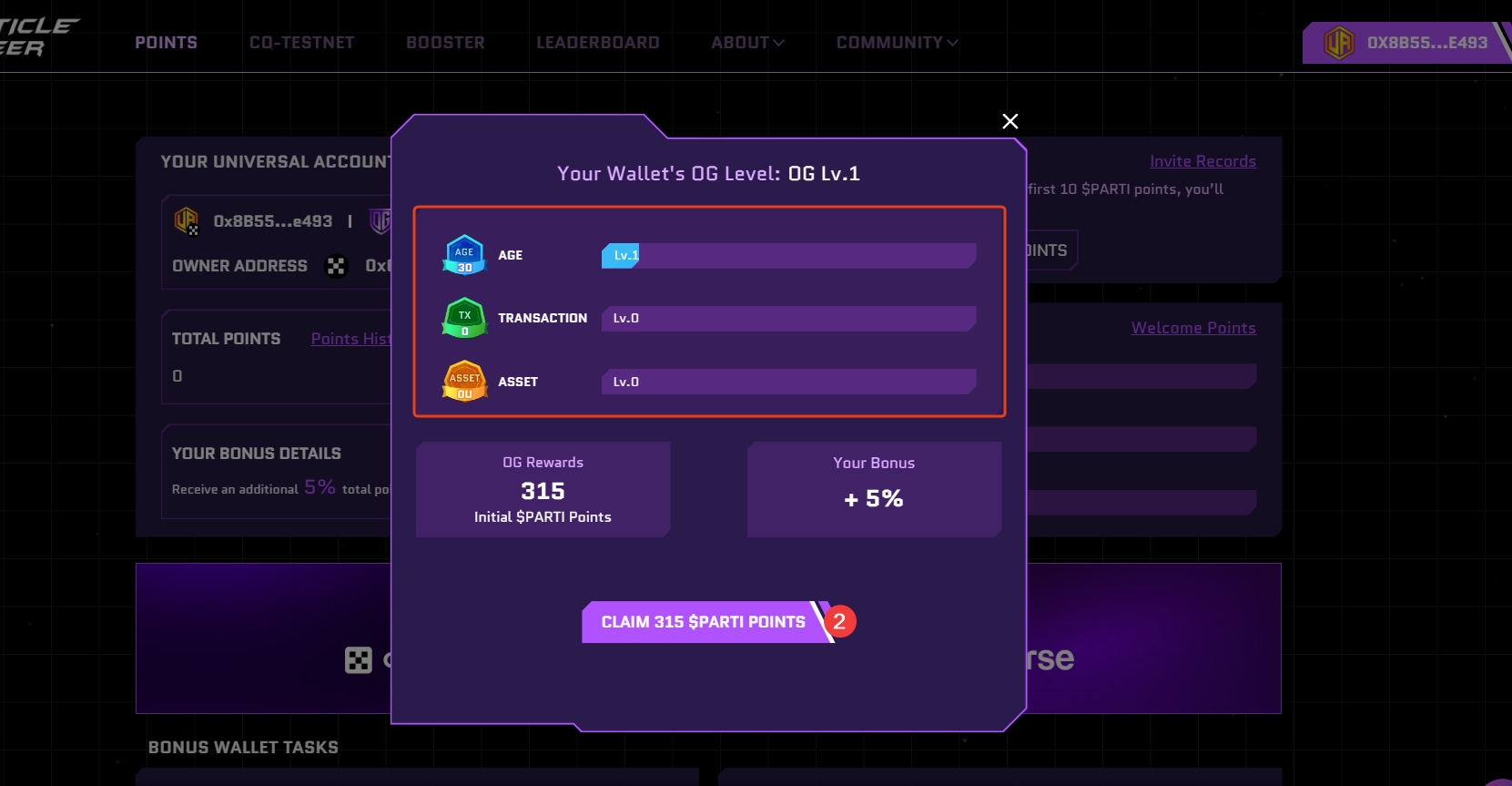 1、进入页面,点击POINTS,在弹框中可以看到钱包使用的时限,如果是使用一直交互的钱包进行登录,那么加成就会多一点,如果使用的是新钱包,那么加成就会极少,建议使用交互,但资产不多的钱包进行登录。