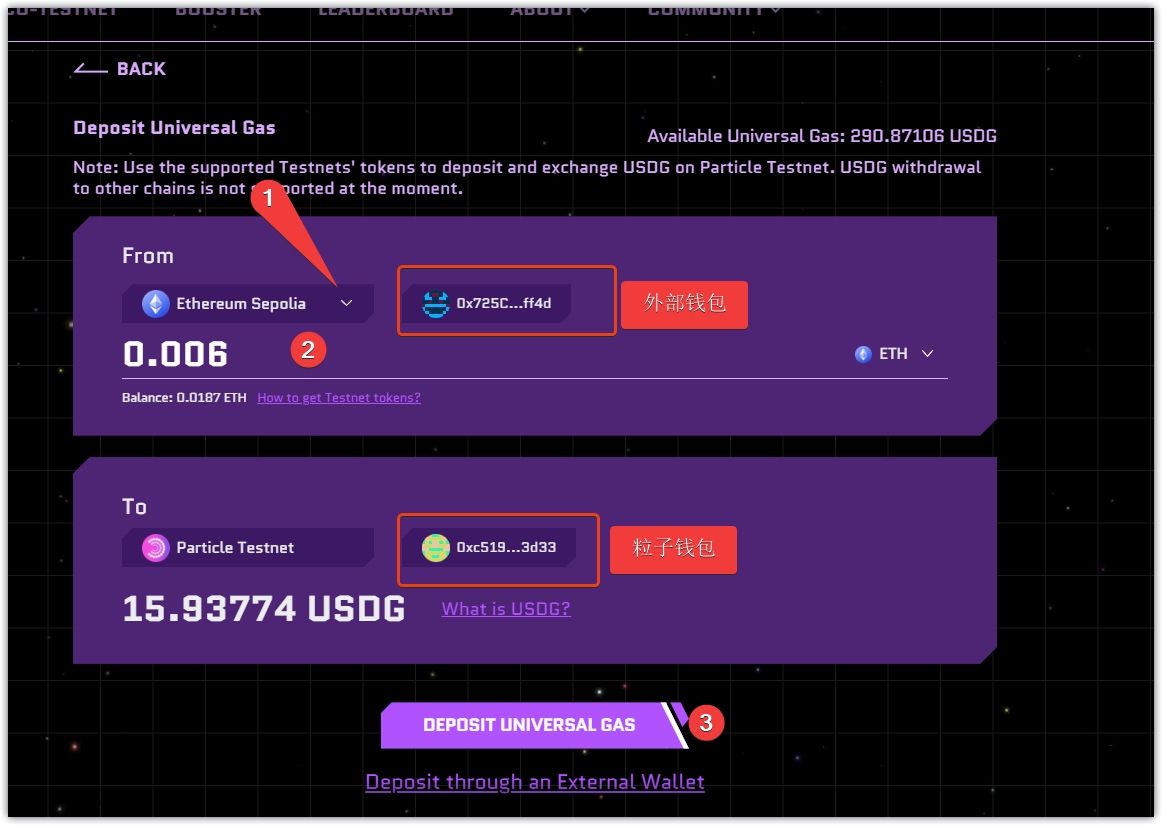 5、选择有测试代币的链,输入金额,点击DEPOSIT UNIVERSAL GAS,钱包确认。