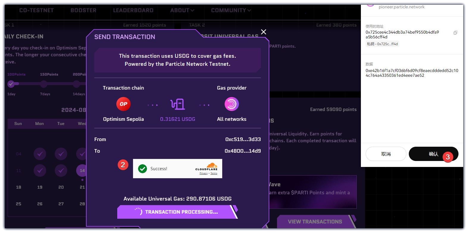 6、点击CHECK-IN,在弹窗中点击CONFIRM,点击验证,钱包确认。