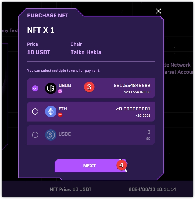 7、购买PURCHASE NFT,进入页面,选择链,gas最便宜的是Taiko Hekla,其中还有两条暂时不能用的,Linea Sepolia是最贵,建议选择Taiko Hekla,每次购买之后中隔几十秒或者一分钟再进行购买,这样不会报错,点击PURCHASE,在弹窗中点击USDG,点击NEXT,点击PURCHASE,点击验证,钱包确认。