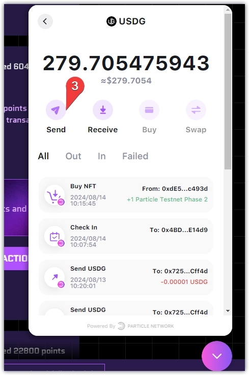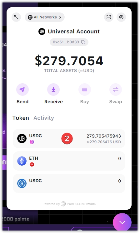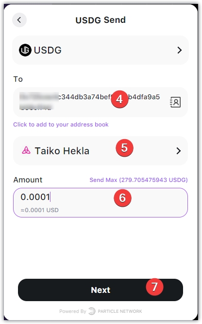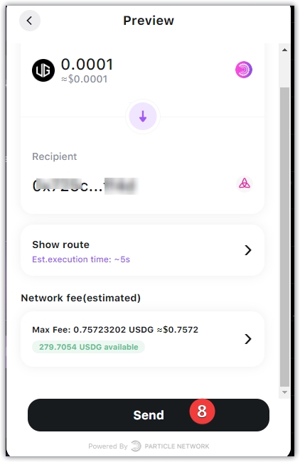 8、点击图标,选择USDG,点击Sed,地址使用绑定的外部钱包即可,选择链,输入金额,点击Next,点击Sed,等个几秒钟点击真人验证,钱包确认,等待链上确认即可。
