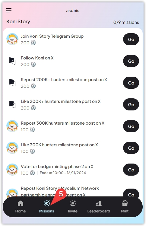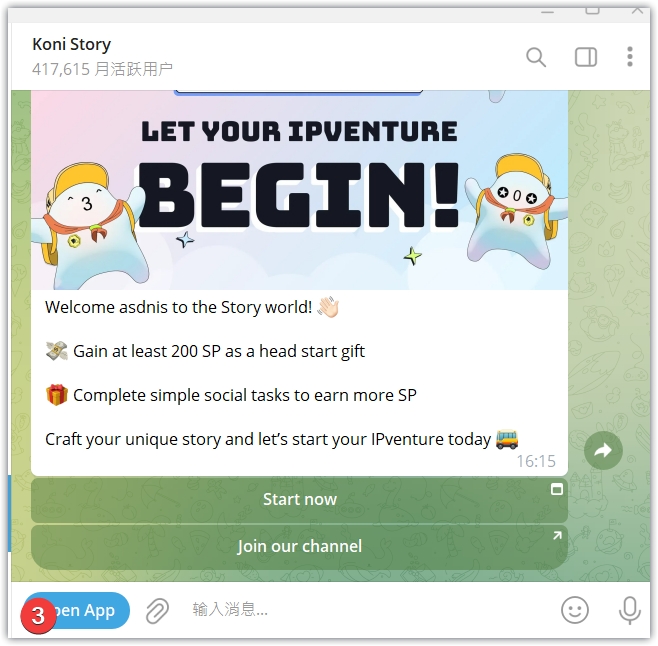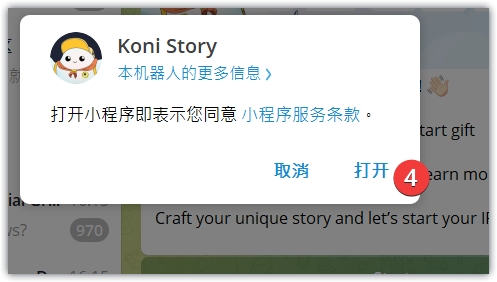 2、点击链接,跳转到TG,打开Koni的电报机器人,打开APP根据指引完成任务,前面两个板块都是简单的社交任务,后面一个,是访问页面,都是可以根据指引完成的。