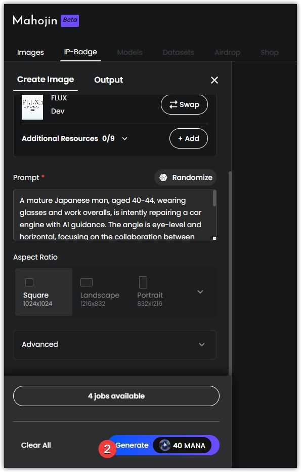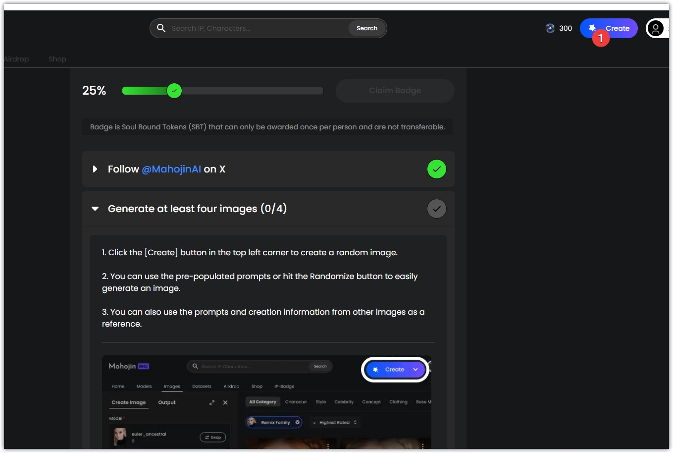 4、任务二,生成图片,点击左上角创建按钮,在右边弹出的窗口中点击Generate,花费40个MAMA,直接生成图片,连续点击四次即可完成,数据读取会有点延迟,多刷新页面,就会显示出来。