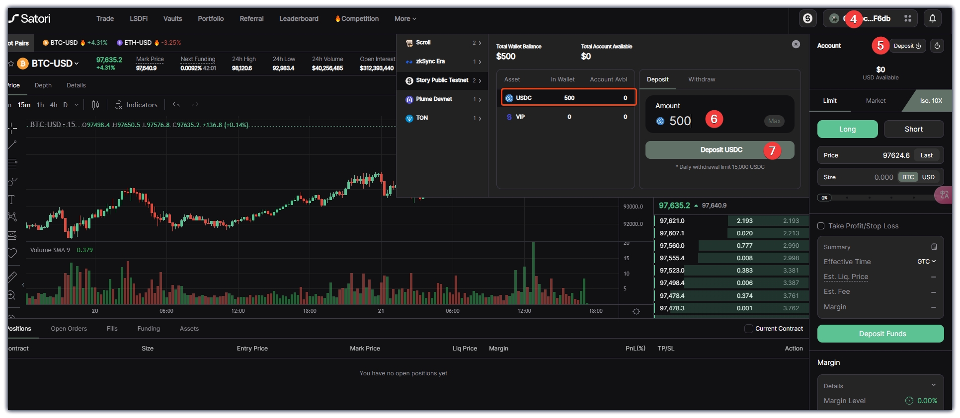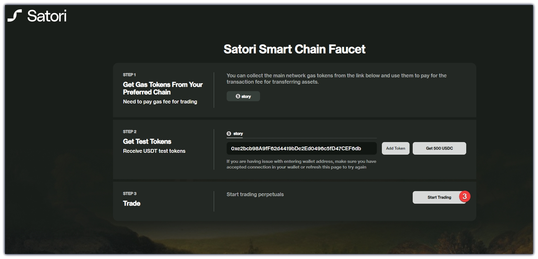 3、任务一与任务二是一起做的,先点击链接: https://t.co/KMM3xQnaUM ,跳转到页面上,链接钱包,点击Get 500USDC,领取测试代币后,点击Start Trading,跳转过去页面,链接钱包,点击Deposit,在弹出的窗口中,输入金额,点击Deposit USDC,钱包确认。