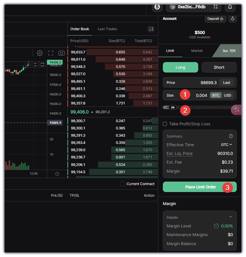 4、任务三,开单,最少开一个10usdc的交易,做多或者做空,输入金额,滑动比例,点击Place Limit Order,钱包确认。