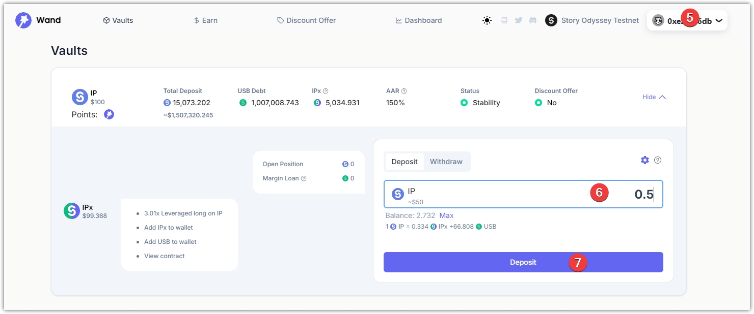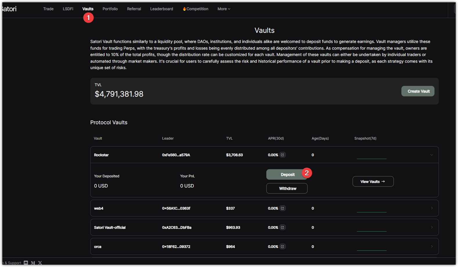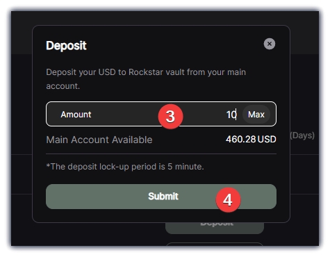 5、任务四,点击Vaults,页面上随意找一存款,点Deposit,在弹出的框中,输入金额,不能低于10USDC,点击Submit,钱包确认。