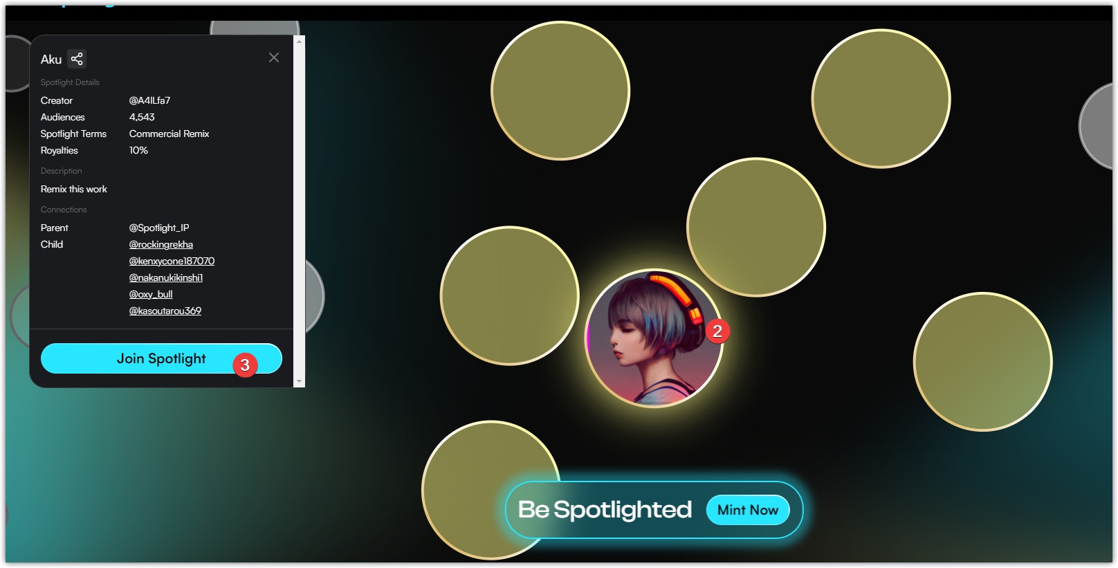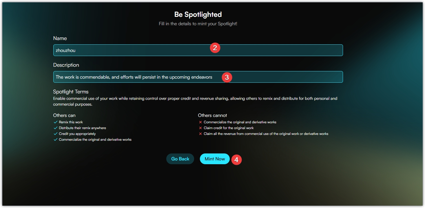 4、任务二,点击Join a Spotlight,进入页面,点击后面任意圆点,点击Joins Spotlight,进入页面,输入名称,填写描述,点击Mint Now,钱包确认。