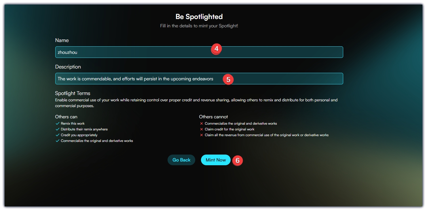 3、任务一,点击Mint a Spotlight,进入页面,输入名称,随意描述一下,点击Mint Now,钱包确认。