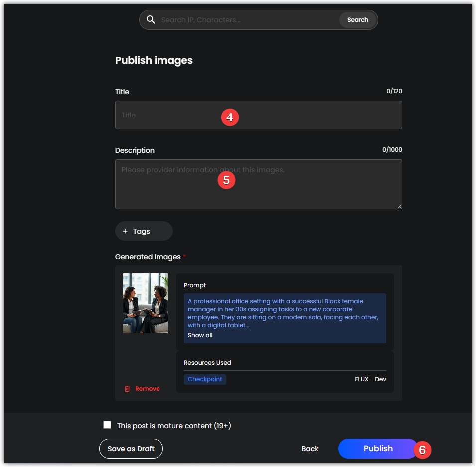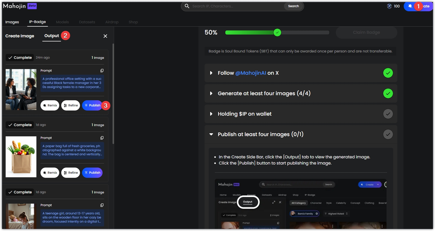 6、任务四,发布四张图片,点击Create,在右侧弹出的窗口中点击Output,点击图片中Publish,跳转页面,输入标题,填写描述后,点击Publishi,钱包确认。发布4张图片后,返回页面刷新后,点击claim。