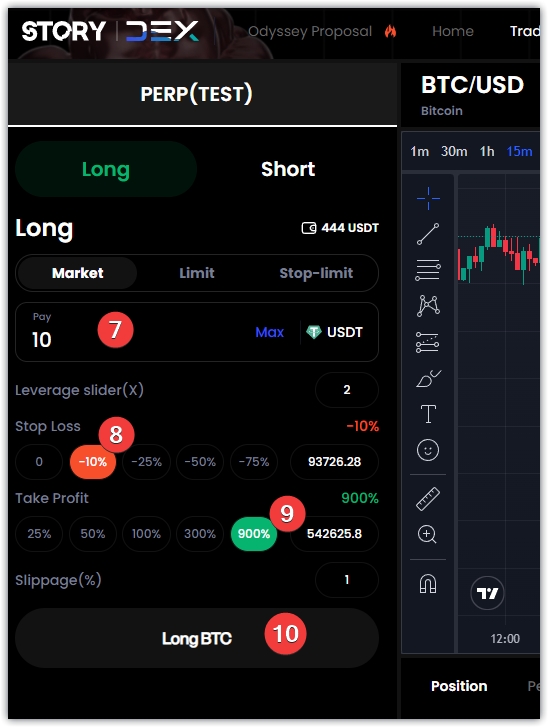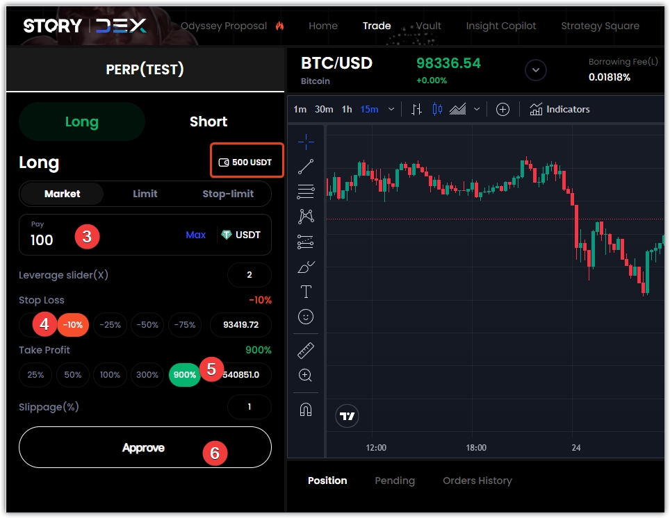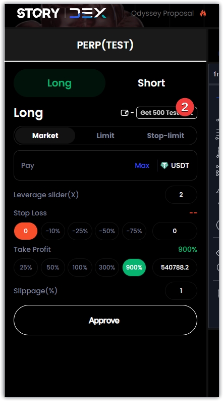3、点击第四个任务,跳转页面,在页面右侧点击Get500TestUsdt,钱包确认,领取代币后,输入金额,不能小于100,设置止盈止损的比例,点击Approve,钱包确认,再次输入金额,这次不能小于5U,高于100U,设置止盈止损,点击LongBTC,钱包确认,等待链上确认。