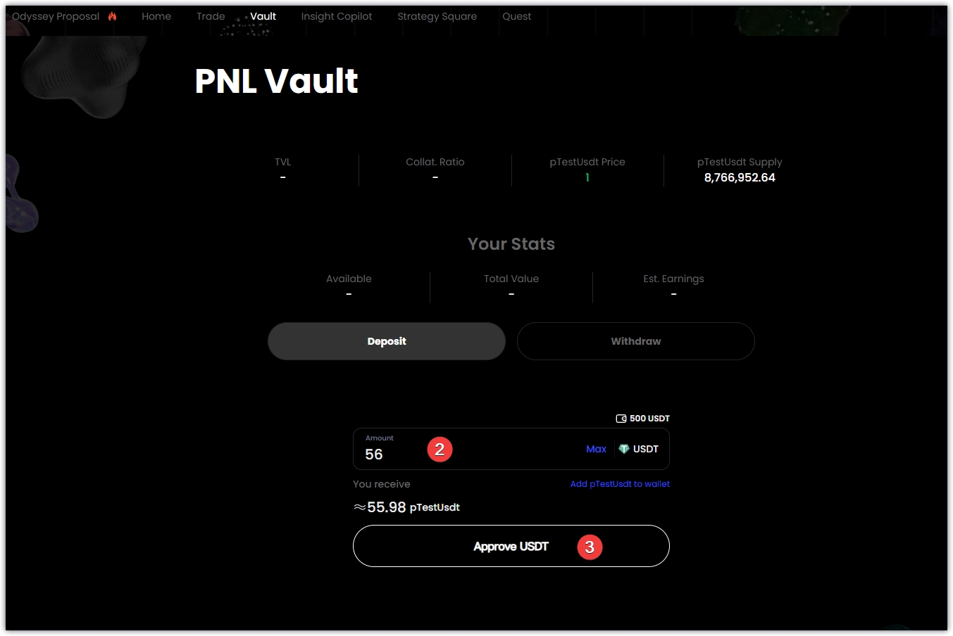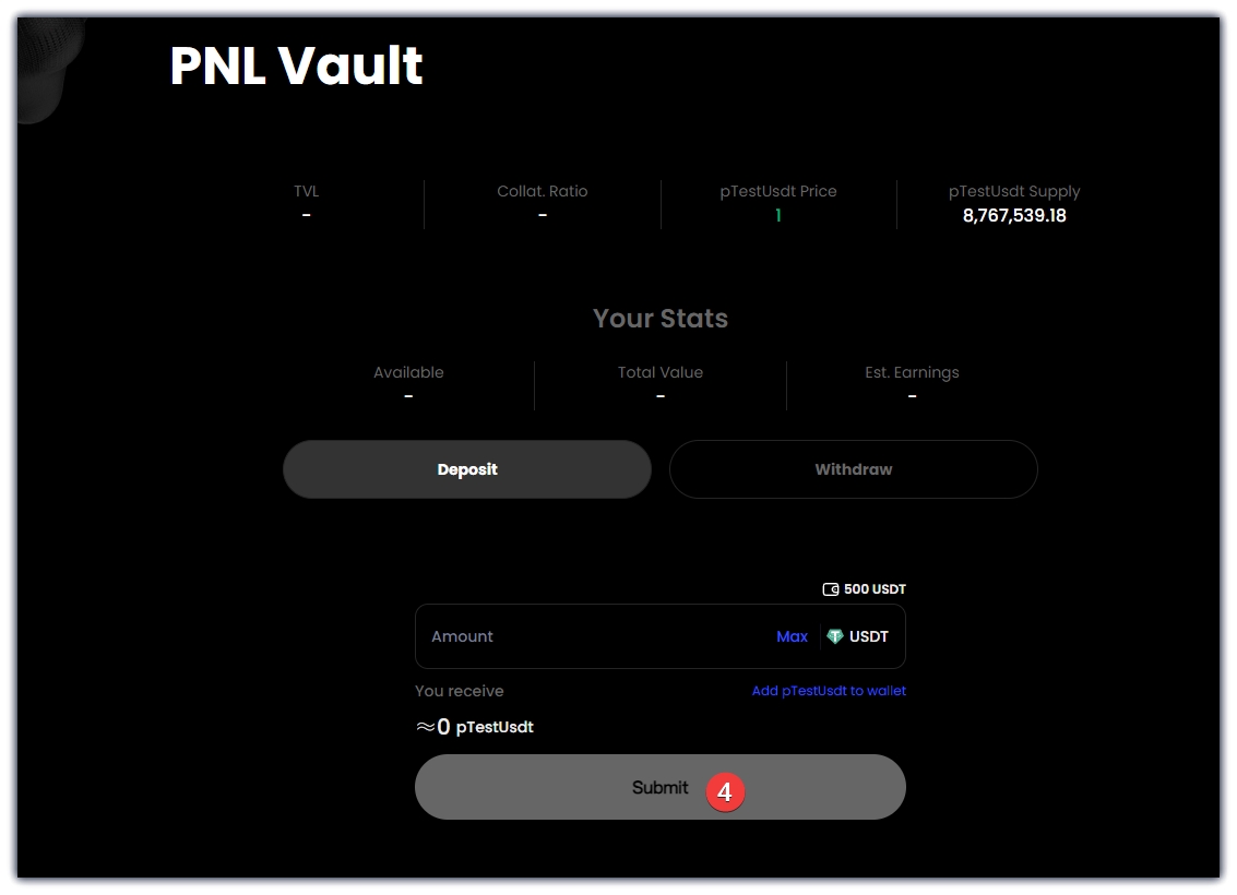 4、点击任务五,跳转到页面,输入随意金额,点击Approve USDT,钱包确认,点击Submit,钱包确认,即可完成存入TestUSDT。