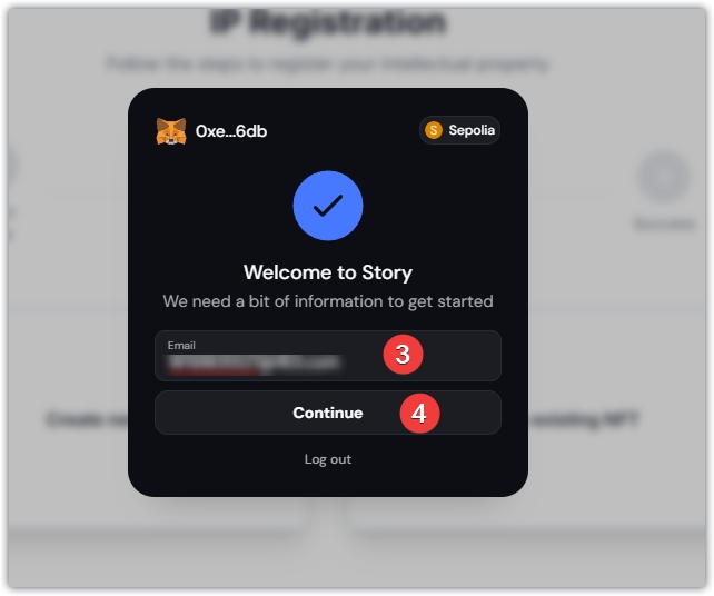 2、点击链接,进入网站,点击Register IP,链接钱包,输入邮箱,点击Continue,输入邮箱验证码。