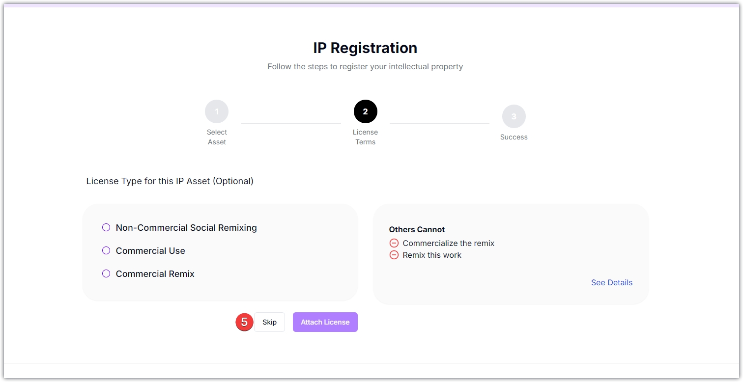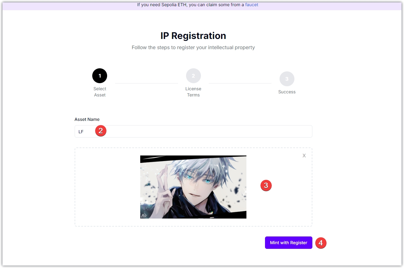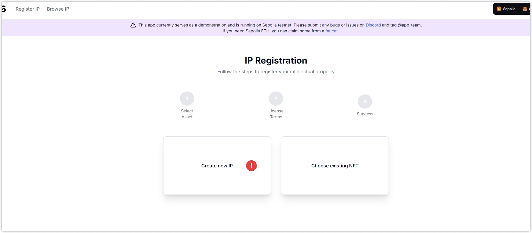 3、跳转注册页面,点击Create new IP,输入名称,上传图片,点击Mint with Register,钱包确认,IP许可证这里直接点击跳过,完成注册