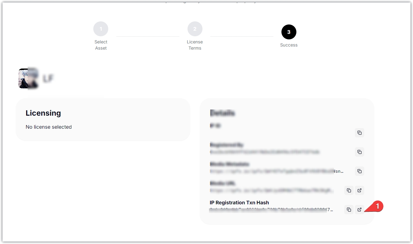 1、在完成注册页面上,点击IP IP Registration Txn Hash右侧的Open URL,页面自动跳转,找到Token ID并复制下来备用。