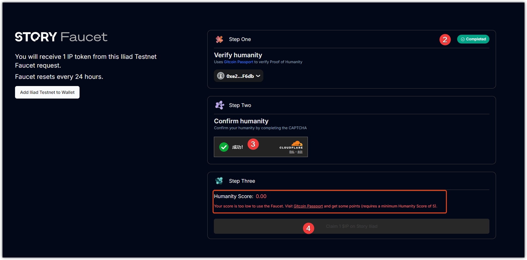 3、点击Story Faucet,跳转到新的页面进行,链接钱包,真人验证,点击Claim,由于我使用的是新钱包,分数不够无法领取。