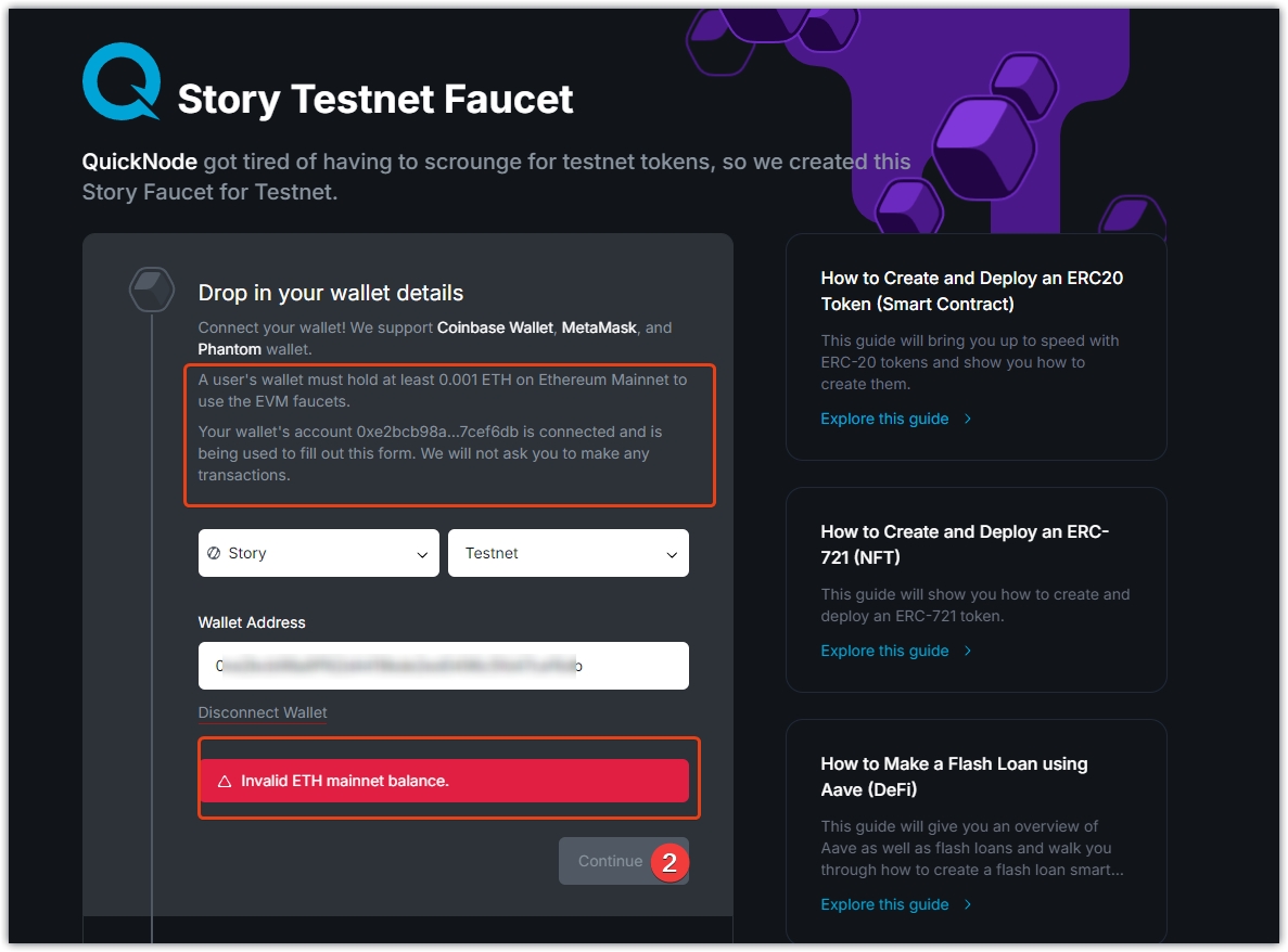 5、点击QuickNod Faucet,跳转到页面上,链接钱包,点击Continue,这个需要ETH主网上有0.001eth。