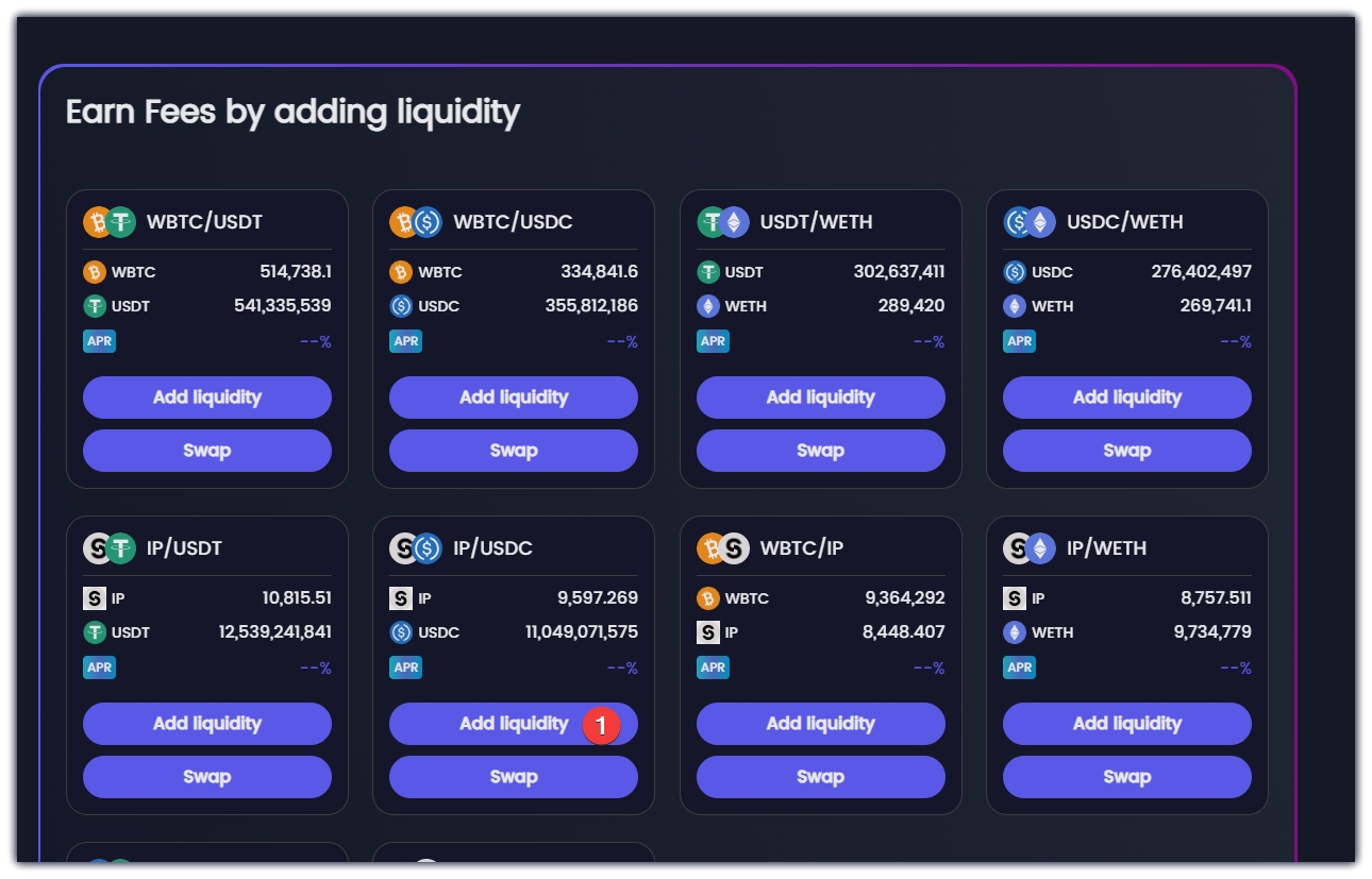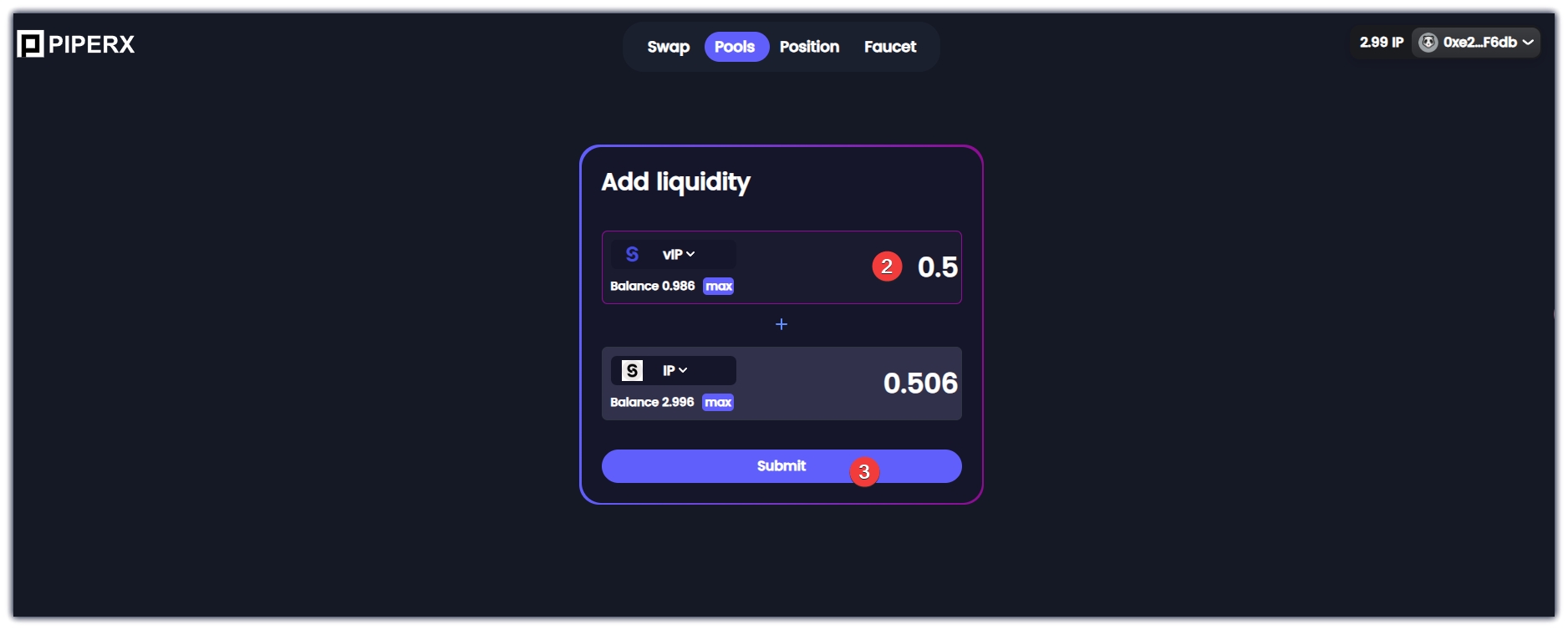 (2)增加流动性,选择已经兑换的代币,点击Add liquidity ,输入数量,点击Submit,钱包确认。