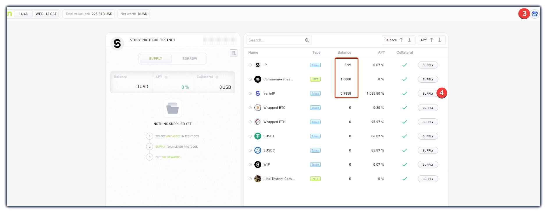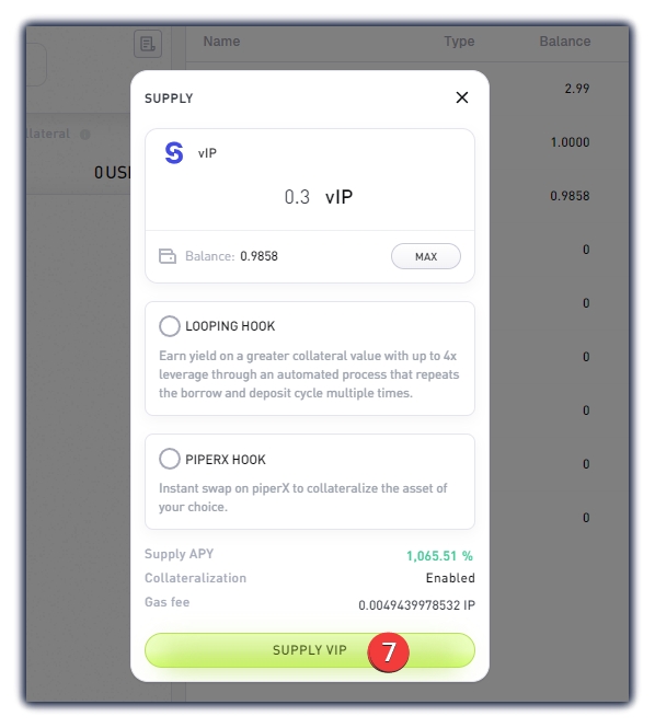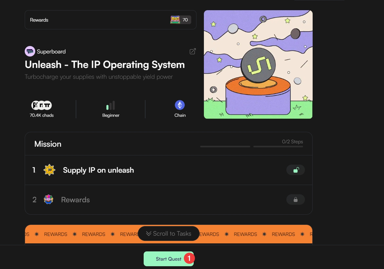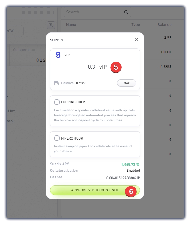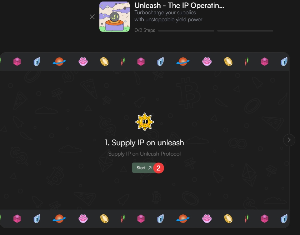 5、点击Start Quest后,点击Start,进入页面,链接钱包,释放已有的代币,点击SUPPLY,在弹出窗口中输入数量,点击APPROVE VIP TO CONTINUE,钱包确认,在窗口中再次点击SUPPLY VIP,钱包确认,即返回页面验证。