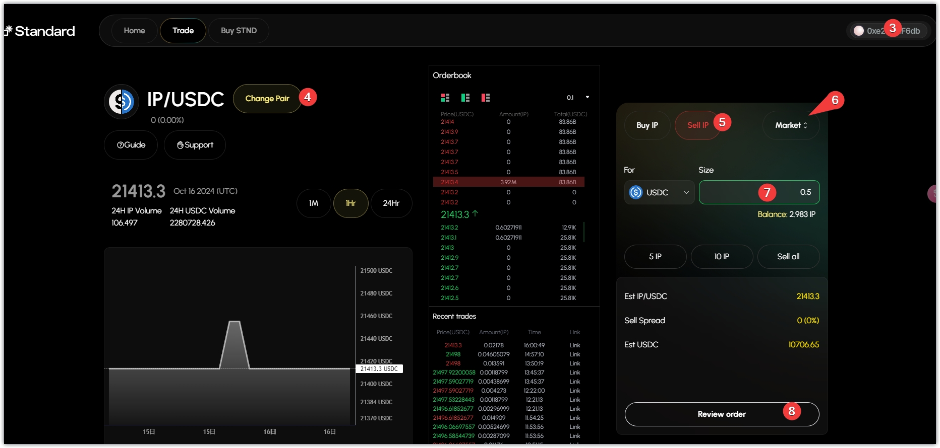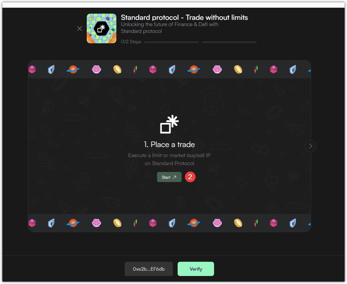 7、点击Start Quest后,点击Start,进入页面,链接钱包,选择IP USDC,选择Sell IP,选择Market,输入数量,点击Review order,在弹出的窗口中点击Confirm market sell lP后,再次点击Ckeck Wallet,钱包确认,可返回页面验证。