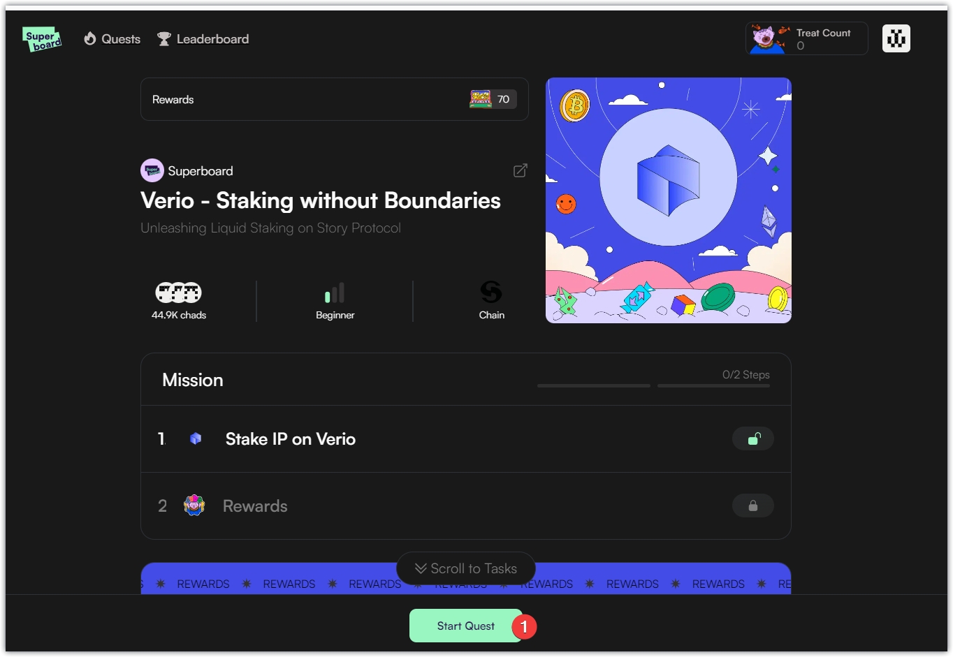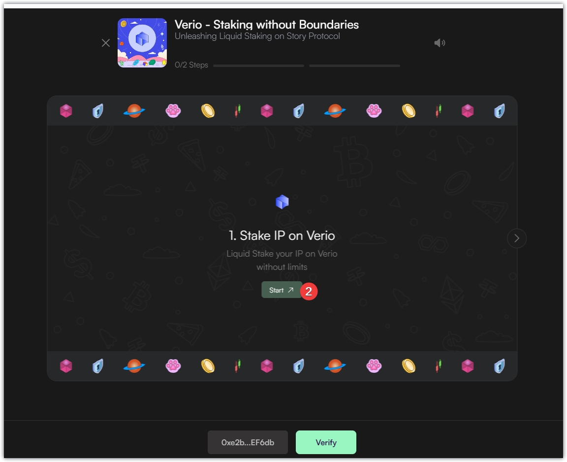 8、点击Start Quest后,点击Start,进入页面,链接钱包,点击Stake Now,进入页面,输入数量,点击Stake,钱包确认,即可返回页面验证。
