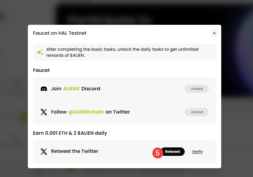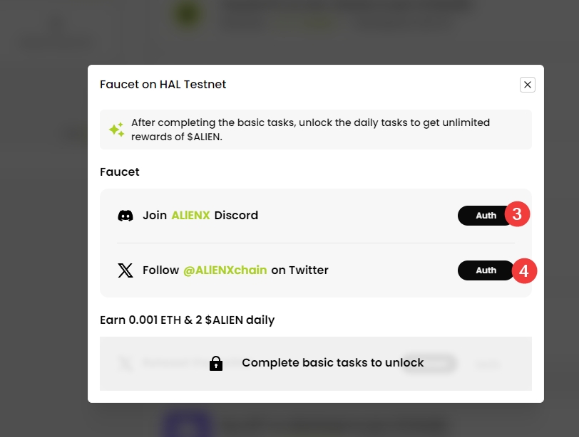 1、进入页面,链接钱包,点击GO Now,在弹窗中点击Auth,授权DC,关联推特账号,转发推文,钱包既可到账0.001ETH测试代币与两个ALIENX