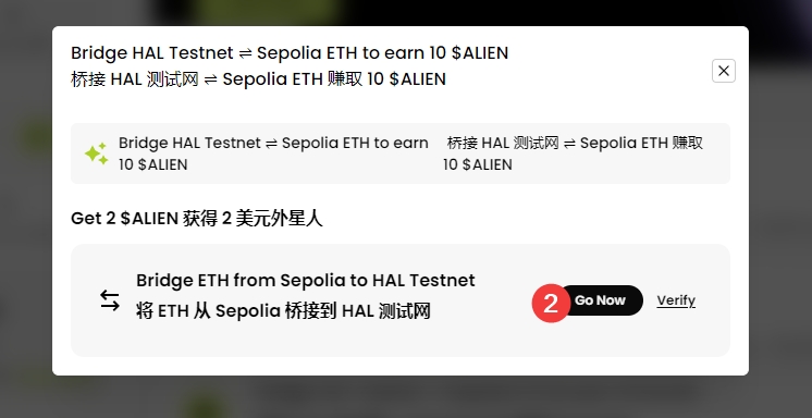 3、交互,使用测试网代币,点击Go Now,在弹窗中再次点击Go Now,跳转到页面上,输入数量,点击Bridge,钱包确认,可进行五次,一次2分。从Sepolia跨链到Hal。