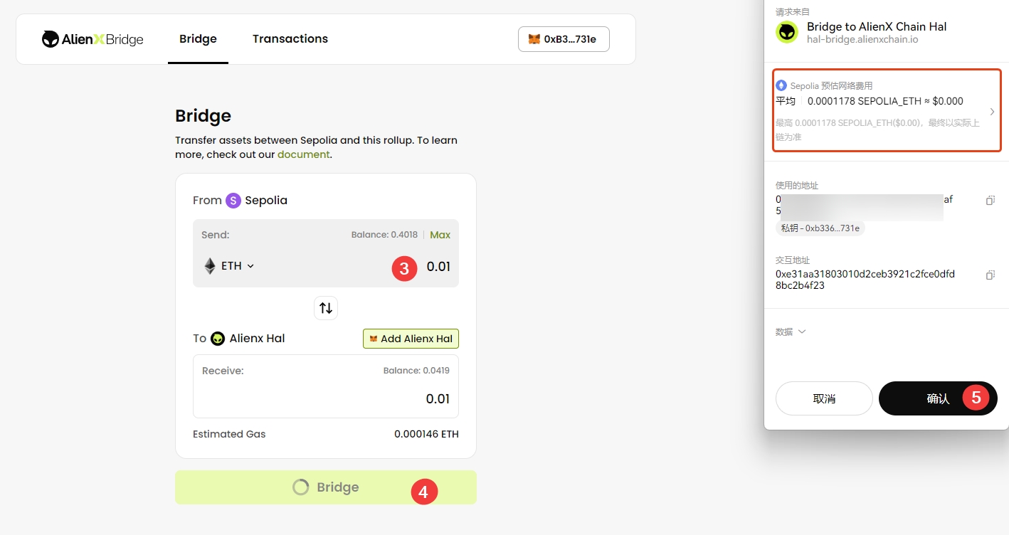 3、交互,使用测试网代币,可进行五次,一次2分。从从Sepolia跨链到Hal。