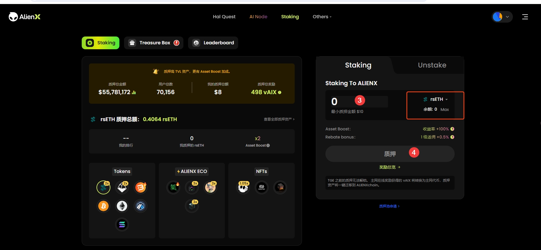 4、质押,点击Go Now,在弹窗中点击staking,跳转到页面上,链接钱包,使用rsETH代币进行质押,收益率会增加,使用一些主流的代币质押,收益率是不会有增加的。
