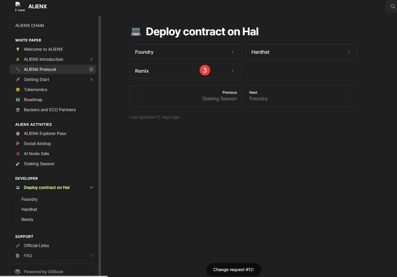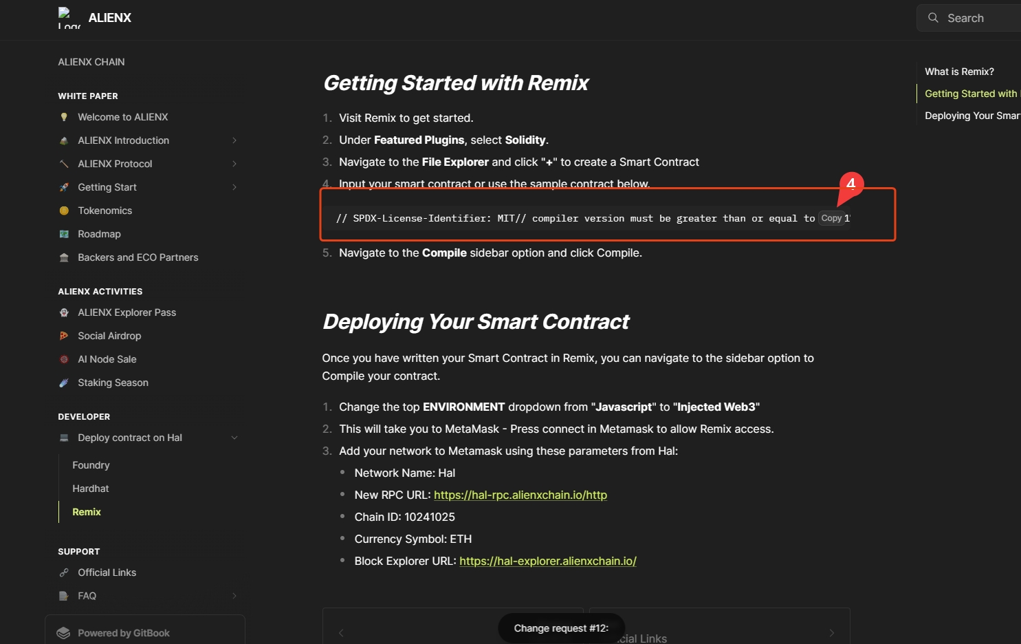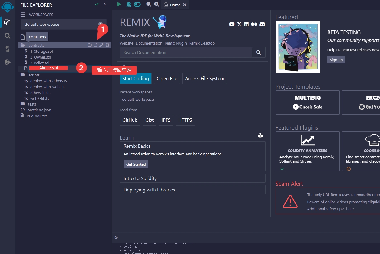 (1)先在部署合约网站添加Alienx,再去到官方文档页面,点击Remix,鼠标移键移到代码上,点击copy,复制代码,回到部署合约网站页面,粘贴到面板上面,每一条点击一下回车键,点击Solidity compiler,点击Copile Alienx.sol。