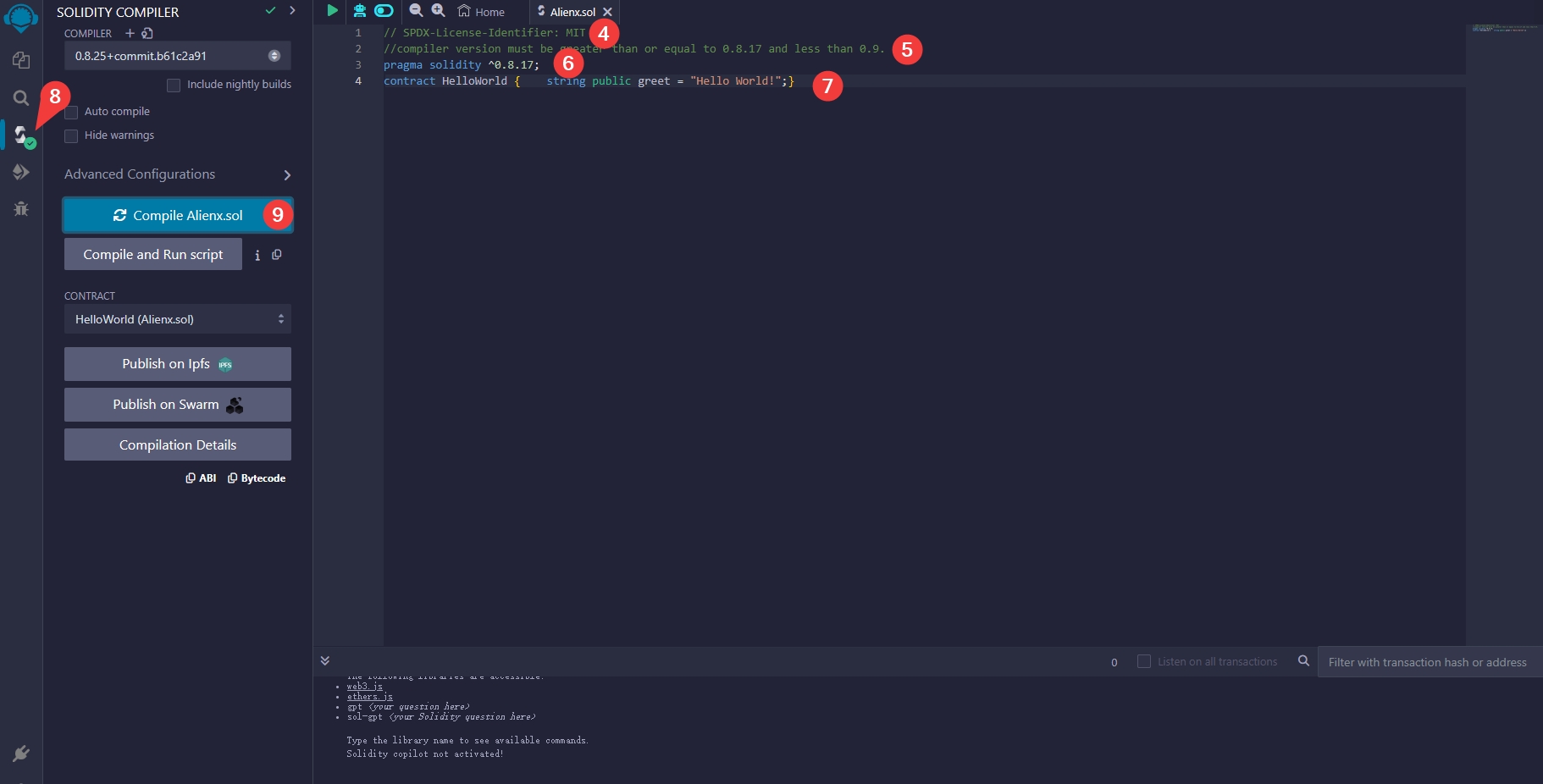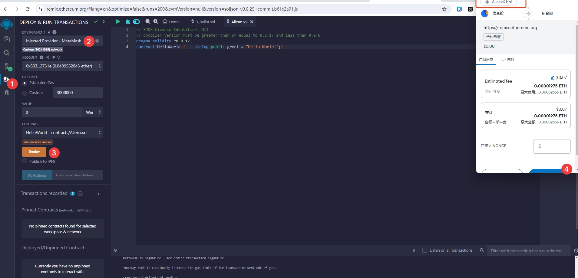 5、用Alienx Hal发布合约,此处使用的是remix和官方提供的合约代码。