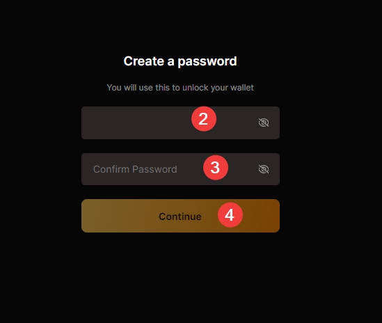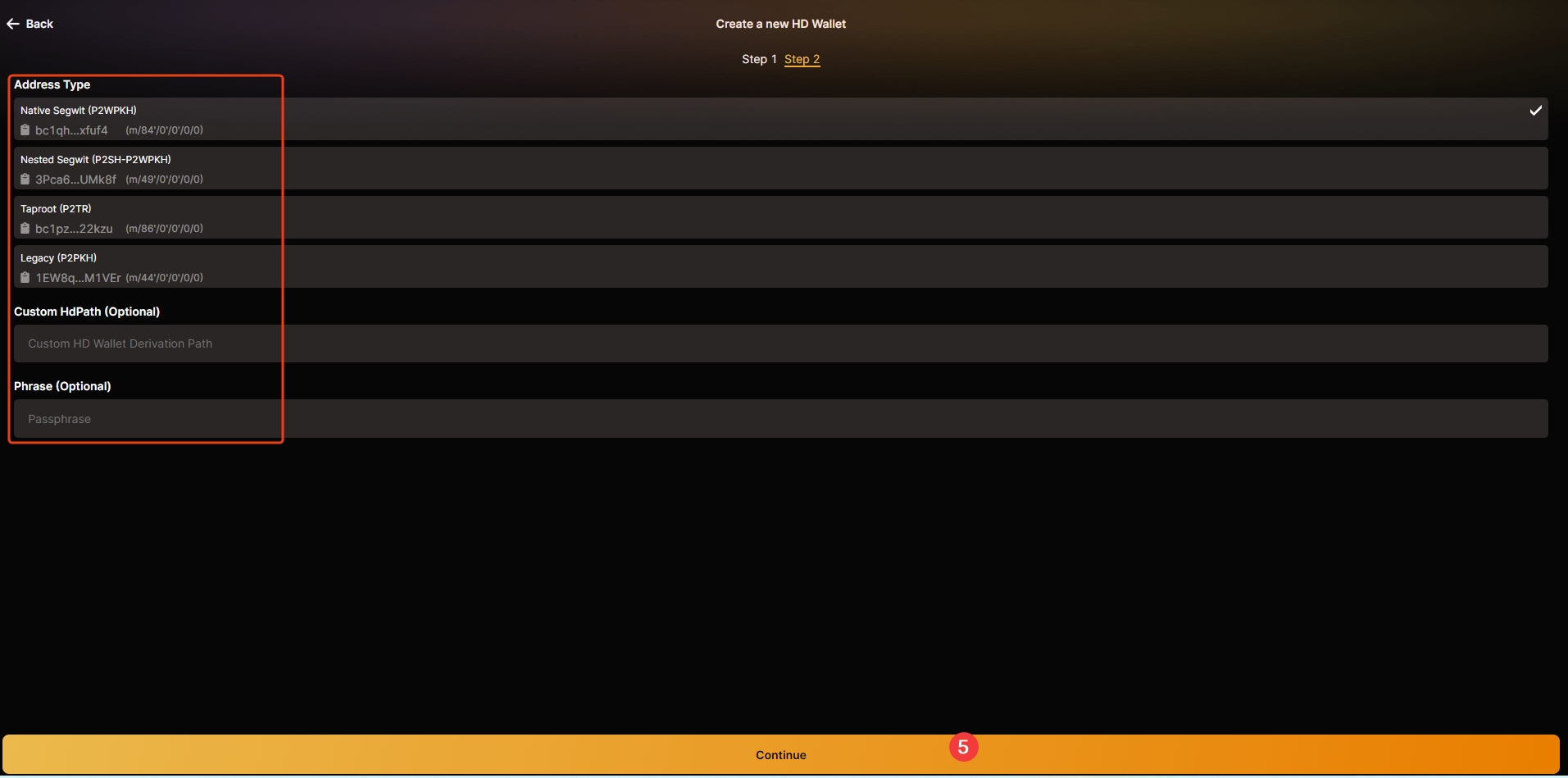 3、页面上点击Create new wallet创建,输入密码,确认密码,点击Continue,把助记词记好,点击Continue,选择链,直接选择第一条,bc开头的就好了,点击Continue,即创建成功。