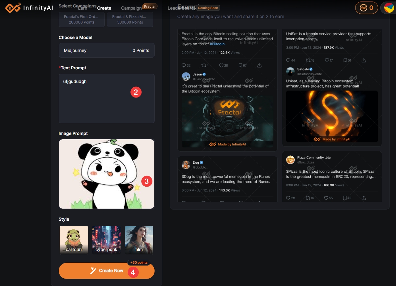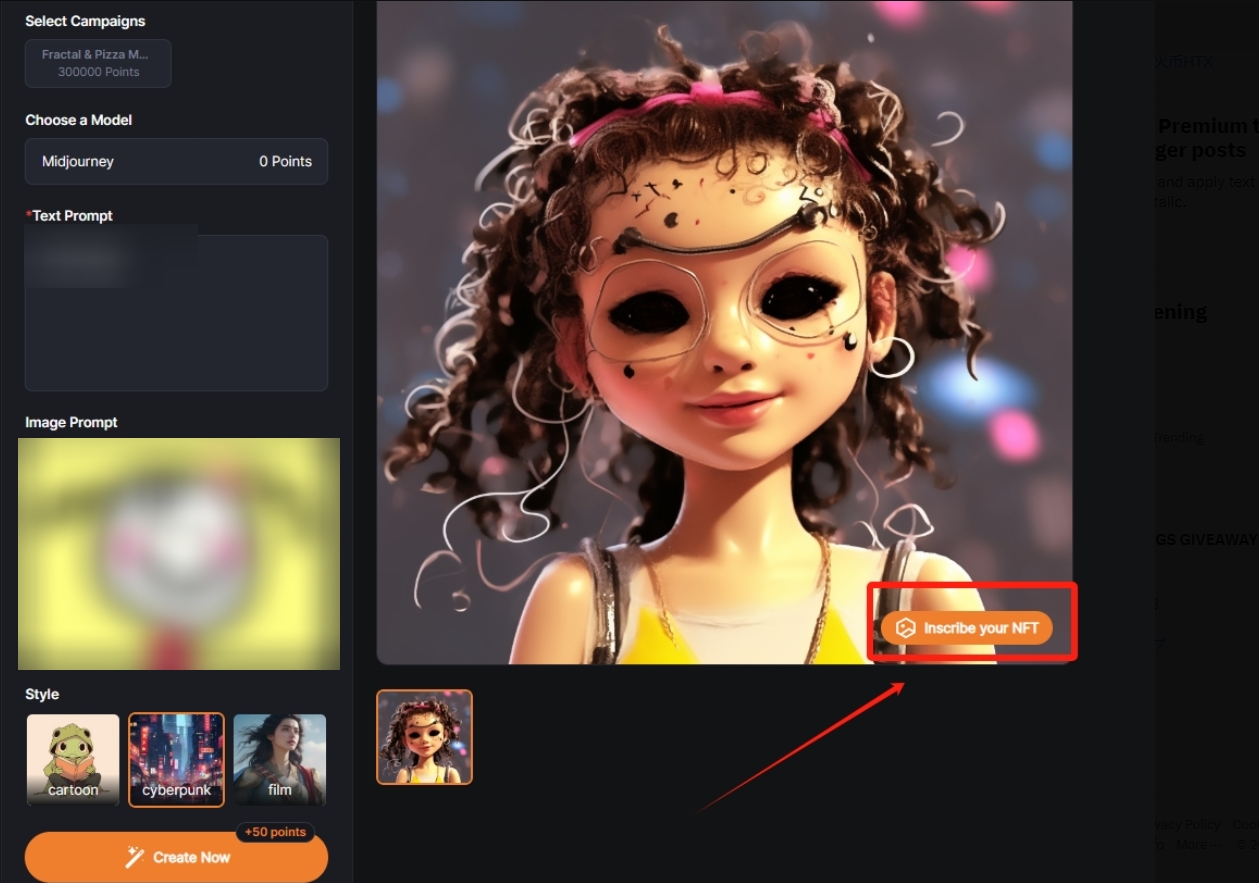 1、点击Create to Earn,进入页面,在左侧输入内容,可以随意写,上传图片,点击Create Now,在右侧点击Inscribe your NFT。