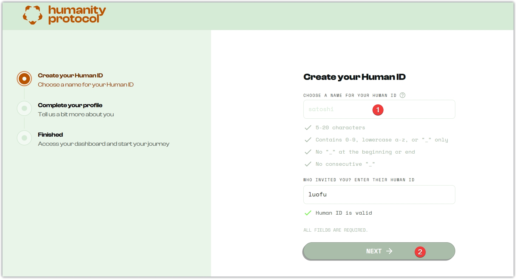 2、进入到注册页面,输入名称,使用链接进入的,邀请码系统已自动填写,点击NEXT。