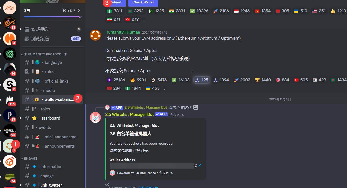 3、加入DC,点击服务器,点击wallet ,点击提交地址,有可能获取白名单,暂时不知道能干啥,但是可以先做了。