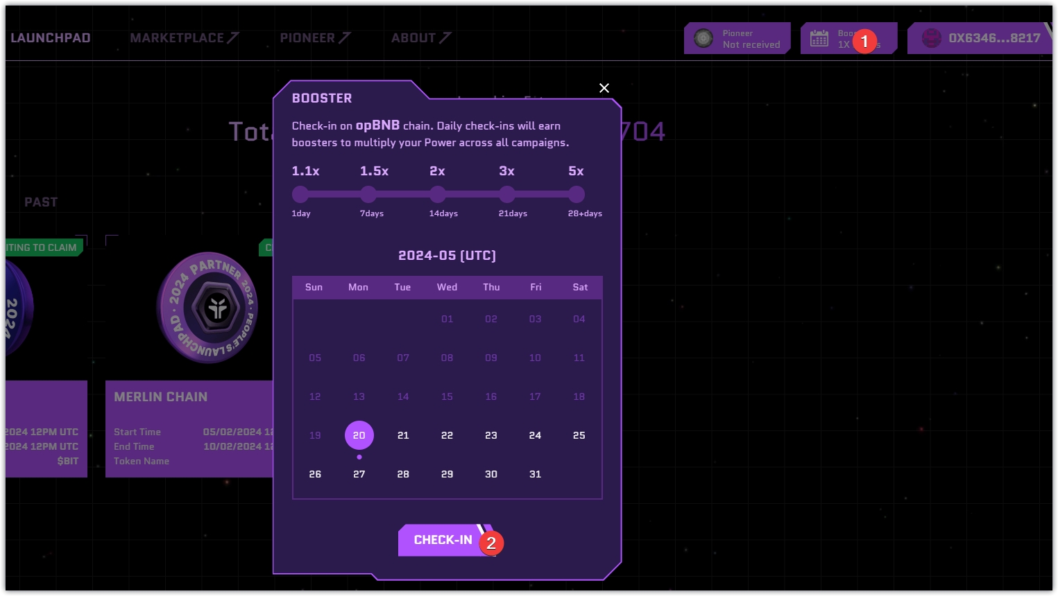 1、进入页面,点击右上角Booster,在弹框中点击CHECK IN ,弹出的智能钱包中点击确认,gas费低到显示不出来。