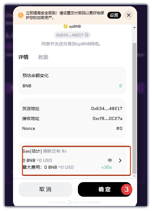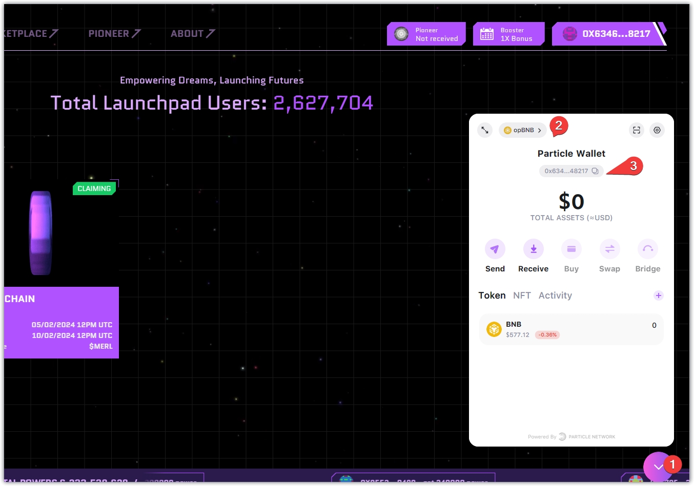 1、点击页面右下角粒子钱包,选择opbnb链,复制智能钱包地址,使用外部钱包转账进去。