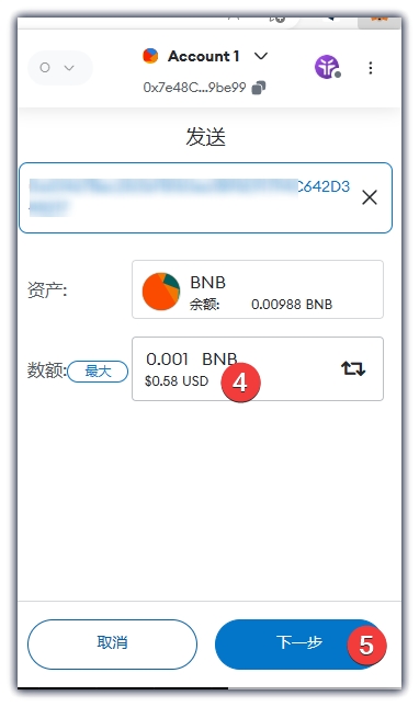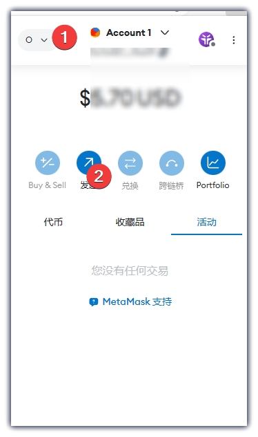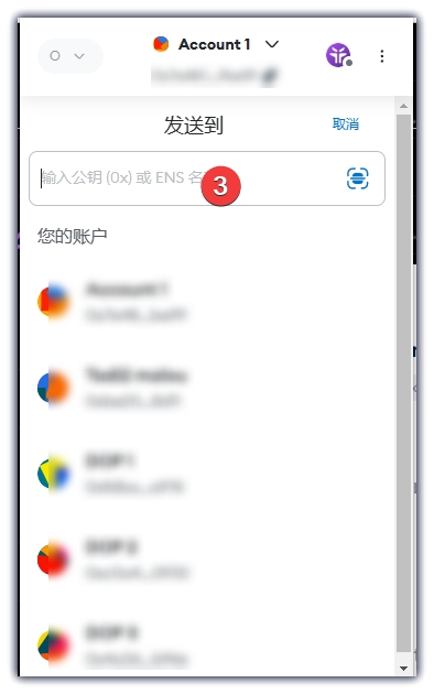 2、以下是使用外部钱包转账进去的步骤,打开小狐狸或者okx,选择链,点击发送,粘贴你的智能钱包地址,输入数量,点击下一步,钱包确认。