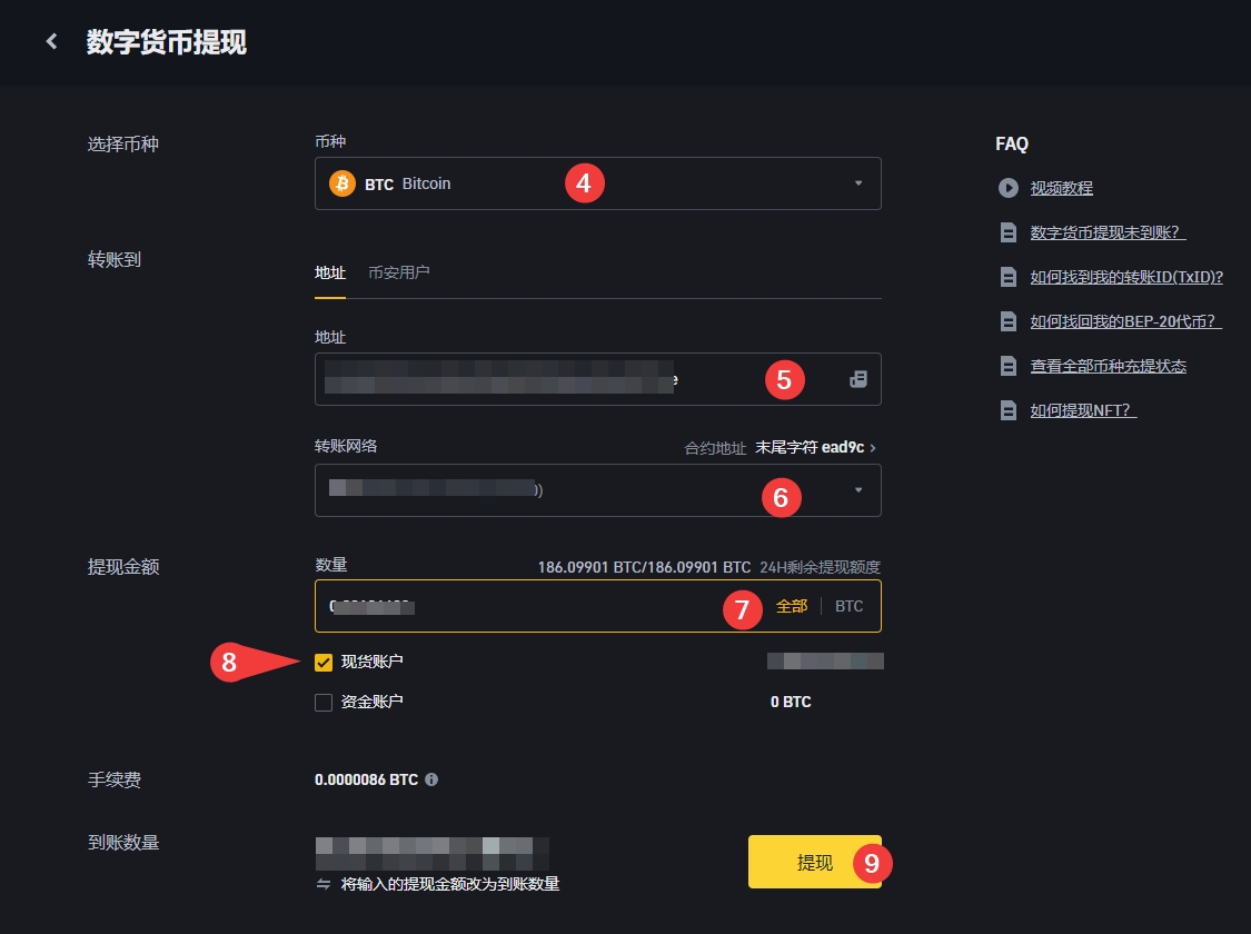3、页面上选择币种,输入钱包地址,选择转账网络,输入数量,选择账户,点击提现即可。