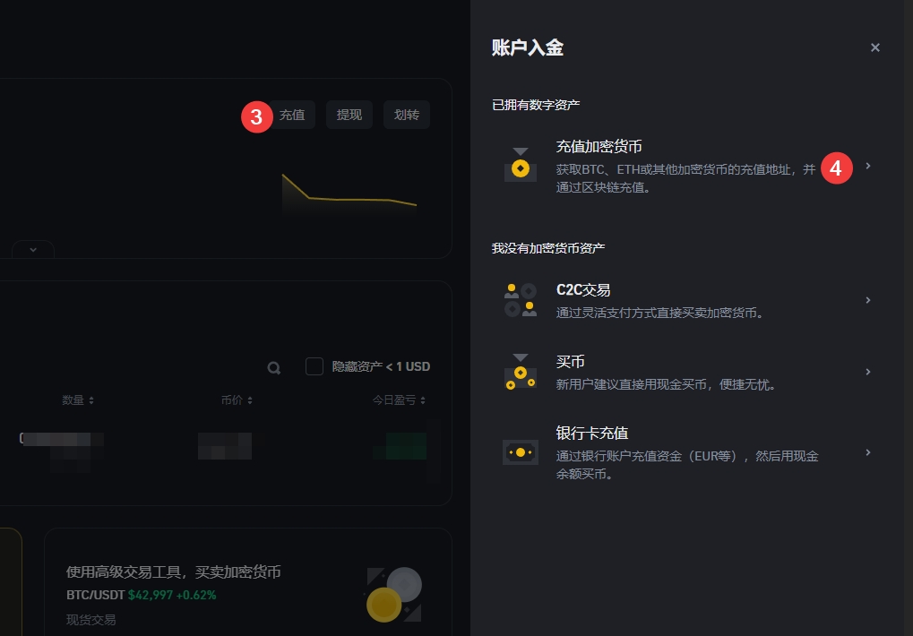 ❗❗注意:充值加密货币,以下是以已拥有数字资产为例写的,如果没有数字资产,可以找小伙伴换。