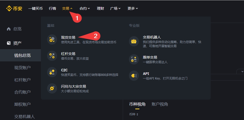 1、页面上方菜单中点击“交易”,在弹出的窗口中选择“现货交易”。