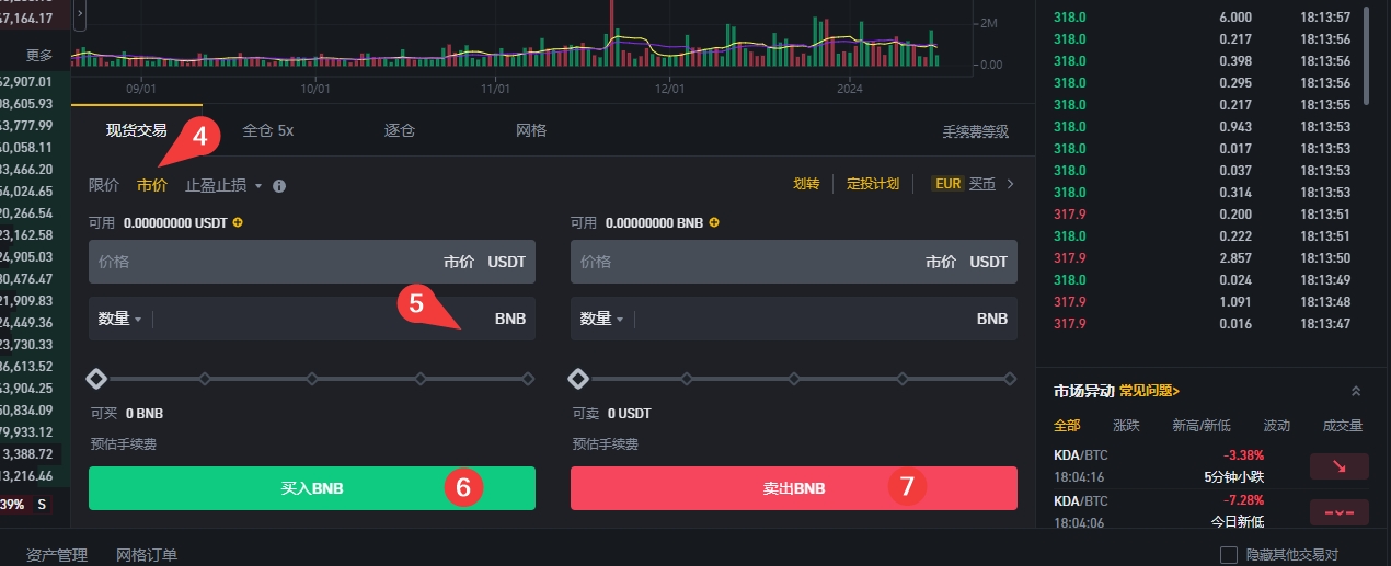 3、页面下方点击市价,输入数量,点击买入,或者卖出,来换兑所需要币种。