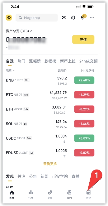 1、打开binance APP,点击资金。
