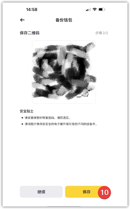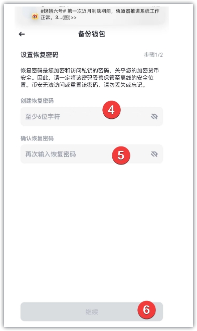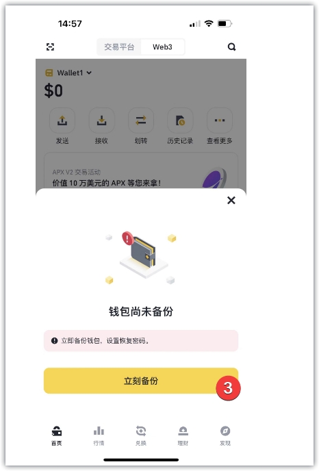 2、点击web3,点击创建钱包,点击立即备份,创建恢复密码,再次输入恢复密码,点击继续,备份之后,点击好的,并在页面上输入恢复密码,点击继续,保存二维码。