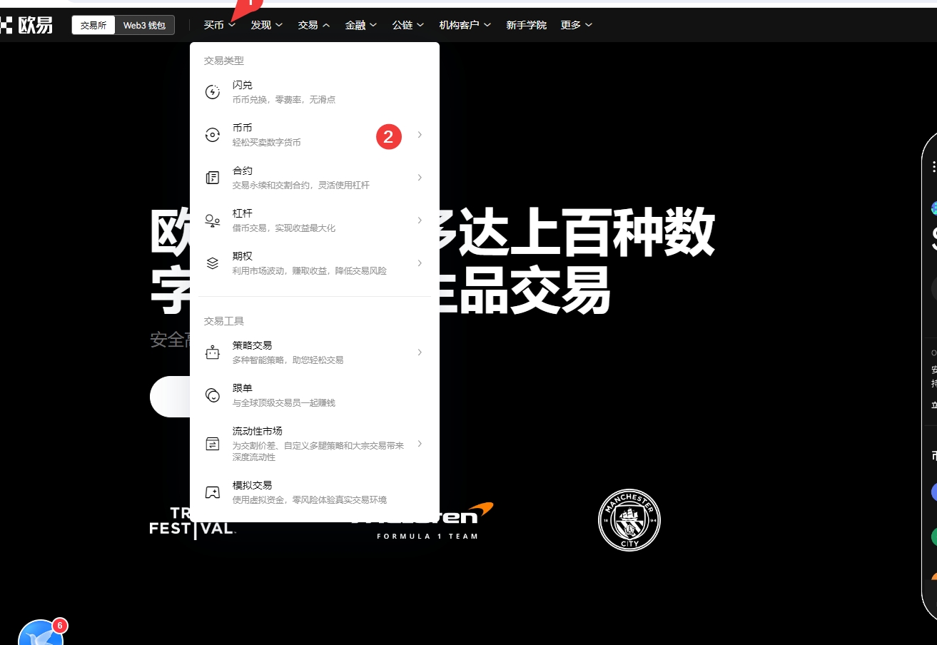 1、到okx交易所中进行换币,点击交易,在弹出的方框中点击币币。